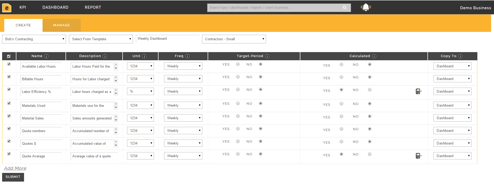 Creating your KPI dashboard is also straight forward, just select the Contractor Template from the create KPI Tab on your EzzyKpi system and it will be loaded in seconds. Select or de-select the KPI metrics you require. You can also easily add additional KPIs that are not included in the template. Then simply enter your KPI data in the Manage KPI section. Click this link to engage a free trail www.ezzykpi.com if you are not already a subscriber.
